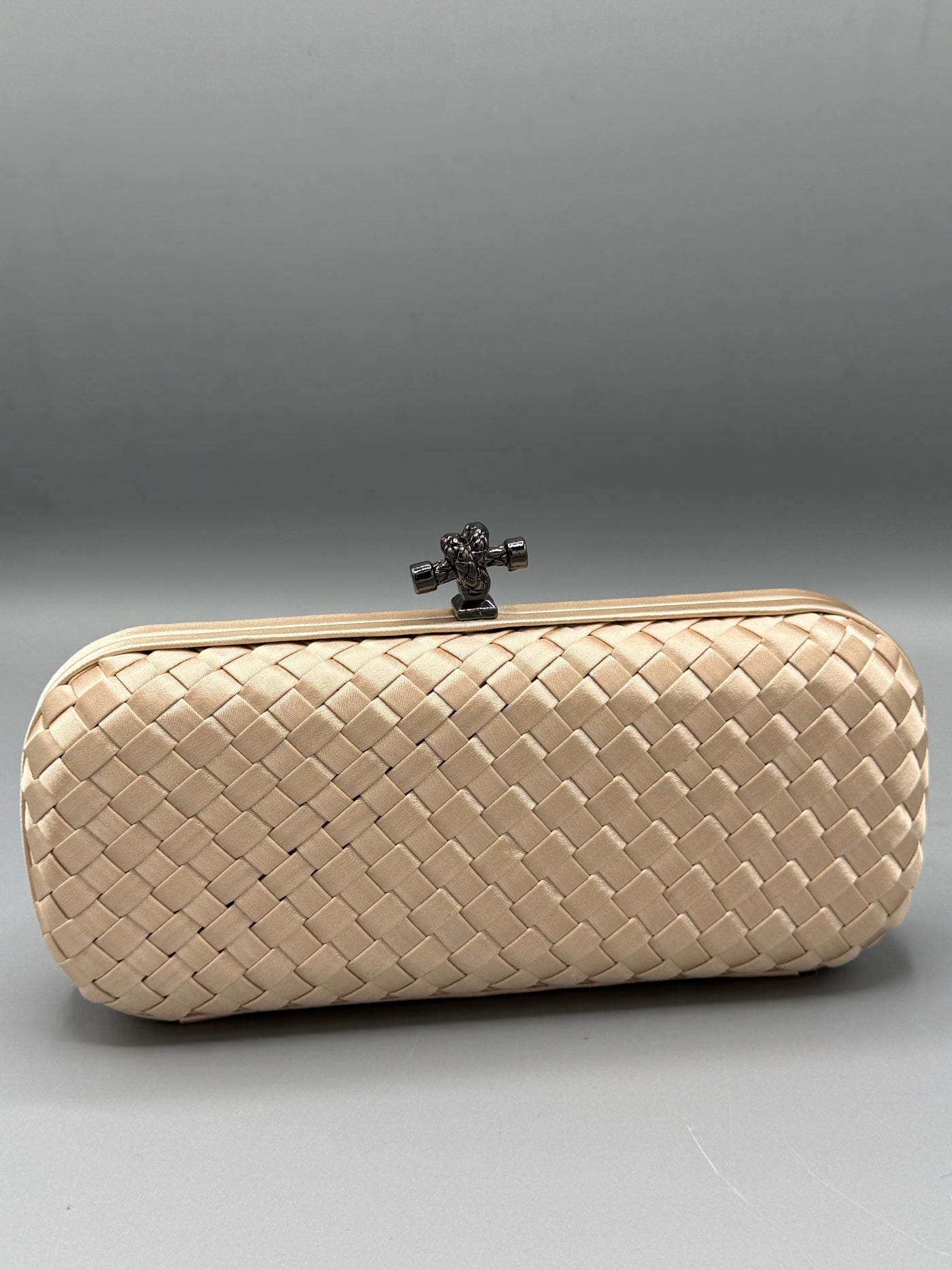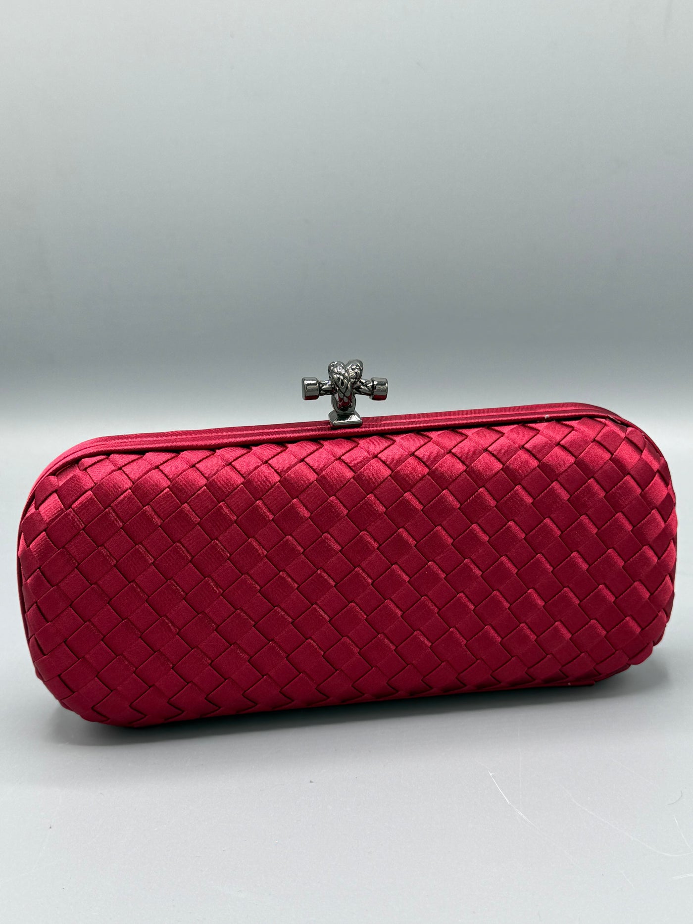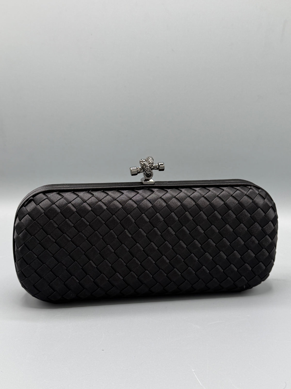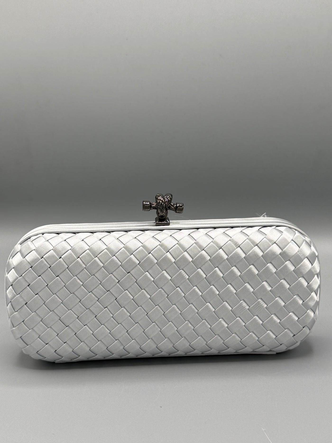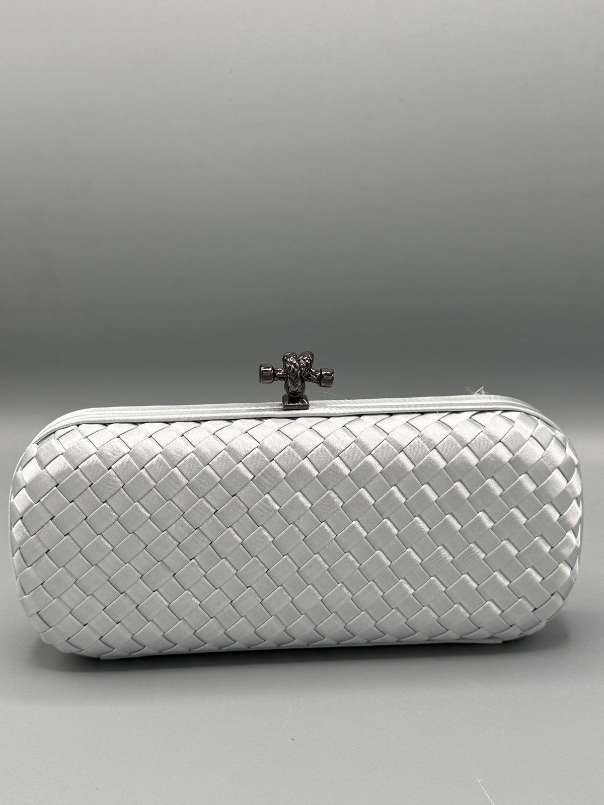 The specific model shown appears to be the Intrecciato Silk Satin Knot Clutch.
