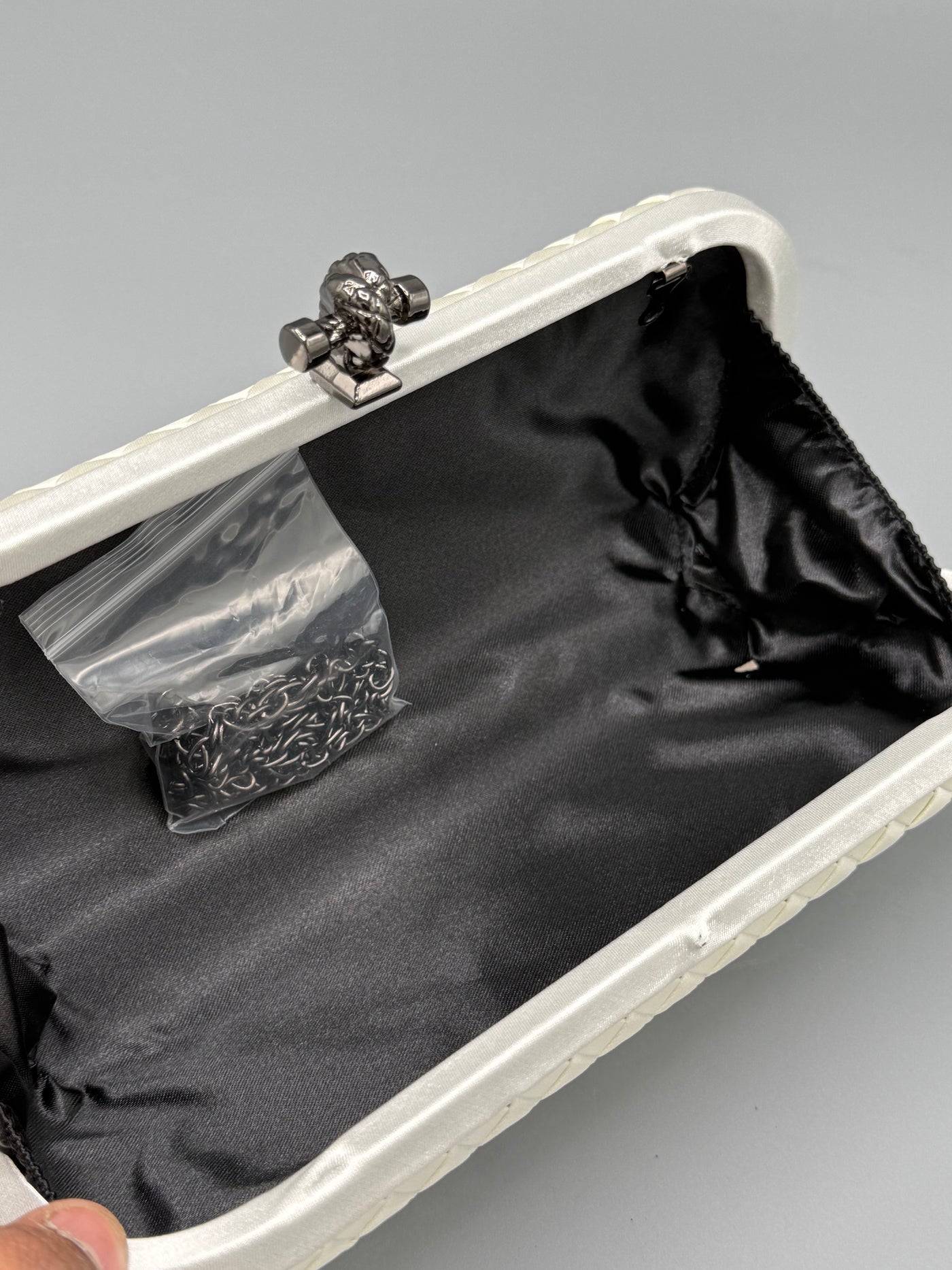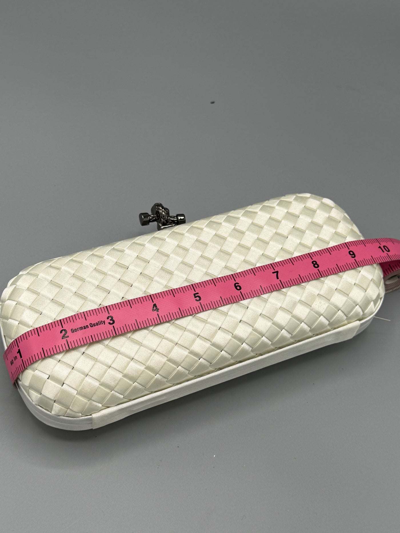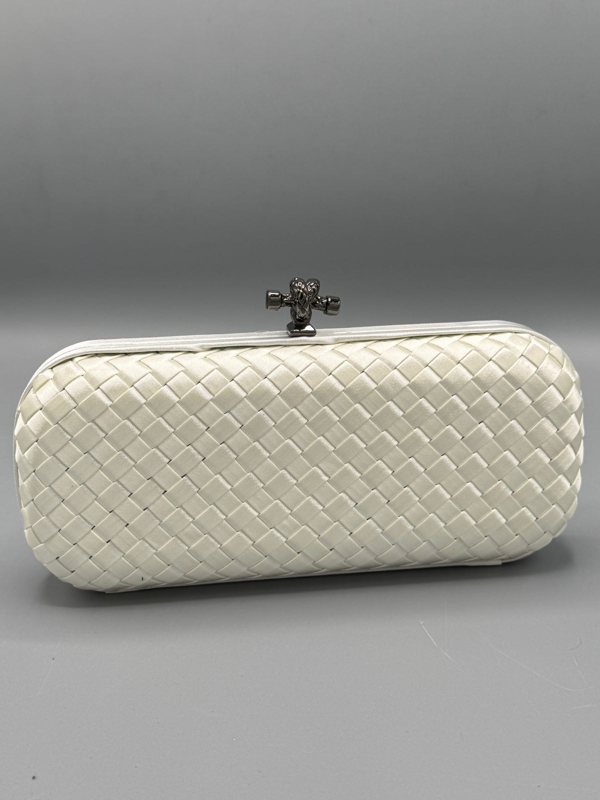 Material: While Bottega Veneta is famous for leather, this particular white version is typically crafted from lustrous silk satin, giving it a soft sheen suitable for bridal or formal evening wear.